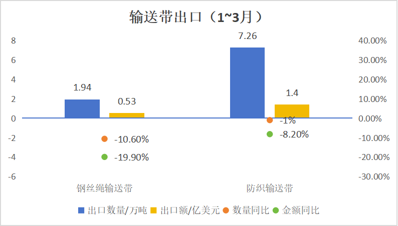 2024年一季度輸送帶出口市場(chǎng)呈現(xiàn)小幅下滑趨勢(shì)。該季度輸送帶出口總量微降1.1%,達(dá)到9.57萬(wàn)噸。出口總額和出口均價(jià)也出現(xiàn)下降,分別下滑9.7%和8.7%,至2.11億美元和2203美元/噸。其中,鋼絲繩輸送帶的出口量下降了10.6%,達(dá)到1.94萬(wàn)噸,出口額和出口均價(jià)也分別下降了19.9%和10.3%,至0.53億美元和2741美元/噸。紡織輸送帶的出口量微降1.0%,達(dá)到7.26萬(wàn)噸,而出口額和出口均價(jià)則分別下滑了8.2%和9.1%,至1.4億美元和1929美元/噸。