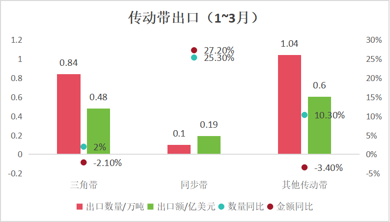 2024年一季度傳動(dòng)帶出口總量增長(zhǎng)了7.2%,達(dá)到1.99萬(wàn)噸,而出口總額也實(shí)現(xiàn)了0.8%的增長(zhǎng),達(dá)到1.26億美元。出口均價(jià)下降了6.0%,至6353美元/噸。其中,三角帶出口量穩(wěn)步增長(zhǎng)2.0%,達(dá)到0.84萬(wàn)噸,但出口額卻微降2.1%,為0.48億美元,其出口均價(jià)也下跌了4.0%,至5649美元/噸。同步帶出口量增長(zhǎng)25.3%,達(dá)到0.10萬(wàn)噸,出口額增長(zhǎng)27.2%,達(dá)到0.19億美元,出口均價(jià)也微升1.5%,至18815美元/噸。