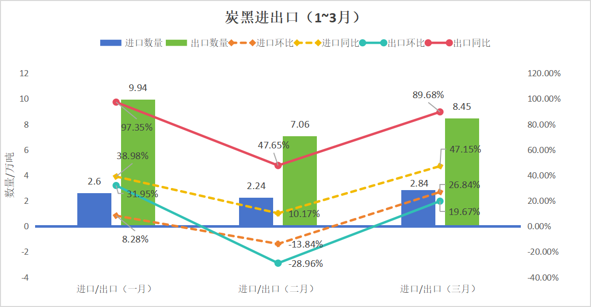 另一方面,隨著中國輪胎與汽車行業(yè)的顯著增長,炭黑的需求也呈現(xiàn)出強(qiáng)勁的增長態(tài)勢。據(jù)統(tǒng)計,2024年1月至3月,中國汽車產(chǎn)量和銷售量分別達(dá)到660.6萬輛和672萬輛,同比攀升6.4%和10.6%。這一成績不僅創(chuàng)下了自2019年以來一季度的新紀(jì)錄,而且顯示出汽車行業(yè)的穩(wěn)健發(fā)展態(tài)勢。尤其是新能源汽車領(lǐng)域,產(chǎn)銷量分別達(dá)到86.3萬輛和88.3萬輛,同比激增28.1%和35.3%,市場占有率穩(wěn)定在30%,彰顯了新能源汽車市場的巨大潛力和快速增長趨勢。中國汽車工業(yè)協(xié)會的專家分析,一季度汽車行業(yè)的平穩(wěn)開局,得益于乘用車和商用車的良好銷售業(yè)績,以及新能源汽車市場的持續(xù)擴(kuò)大。此外,整車出口的高位運行也為行業(yè)增長注入了新的活力。