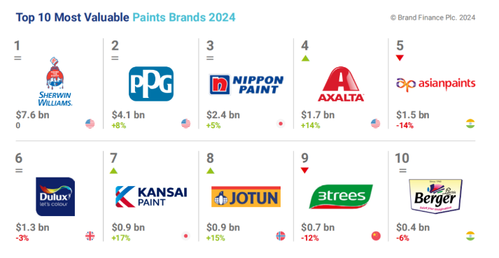 【炭黑產(chǎn)業(yè)網(wǎng)】6月7日消息,全球知名的品牌評估咨詢公司品牌金融近日公布了2024年全球十大最具價值涂料品牌榜單。這也是該公司連續(xù)第三年發(fā)布此類排名。