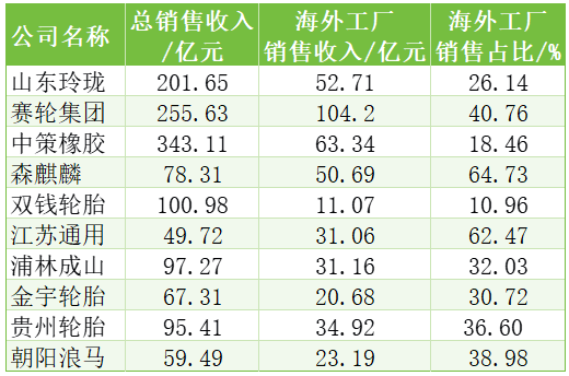 2023年是習近平主席提出“一帶一路”倡議10周年。10年來,海外基地已成為橡膠輪胎行業(yè)產品出口的重要來源和經濟效益的主要支柱。我國海外工廠銷售收入情況見表8。
