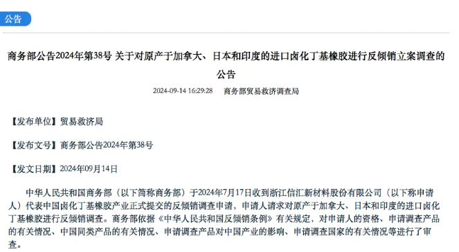 【炭黑產(chǎn)業(yè)網(wǎng)】9月19日消息,近日,中國鹵化丁基橡膠行業(yè)迎來重大進(jìn)展,浙江信匯新材料股份有限公司作為行業(yè)代表,已于2024年7月17日向商務(wù)部正式遞交了針對加拿大、日本及印度進(jìn)口鹵化丁基橡膠的反傾銷調(diào)查申請。此舉標(biāo)志著中國鹵化丁基橡膠產(chǎn)業(yè)在應(yīng)對國際市場競爭中邁出了關(guān)鍵一步。9月14日,商務(wù)部宣布正式啟動對該申請的反傾銷立案調(diào)查程序。