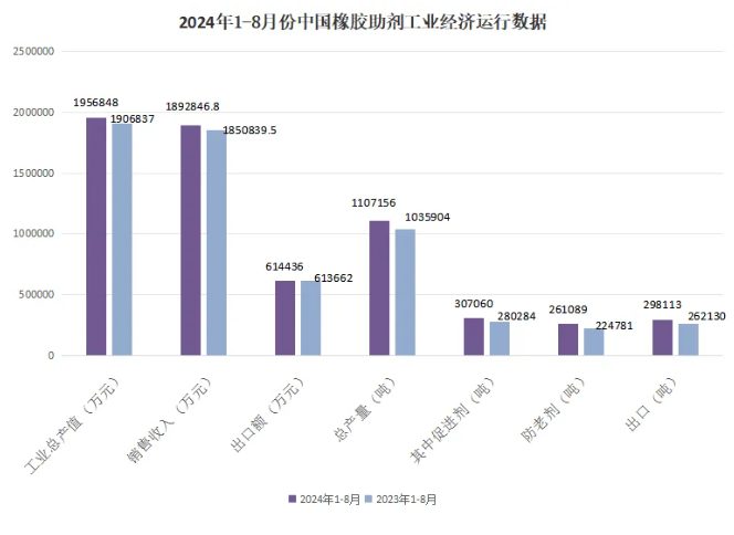 2024年1-8月份工業(yè)總產(chǎn)值195.68億元,同比增長(zhǎng)2.62%;銷售收入189.28億元,同比增長(zhǎng)2.27%;出口額61.4億元,同比增長(zhǎng)0.13%;總產(chǎn)量110.07萬噸,同比增長(zhǎng)6.88%;出口量29.81萬噸,同比增長(zhǎng)13.73%;其中橡膠促進(jìn)劑30.7萬噸,同比增長(zhǎng)9.55%;橡膠防老劑26.1萬噸,同比增長(zhǎng)16.15%。