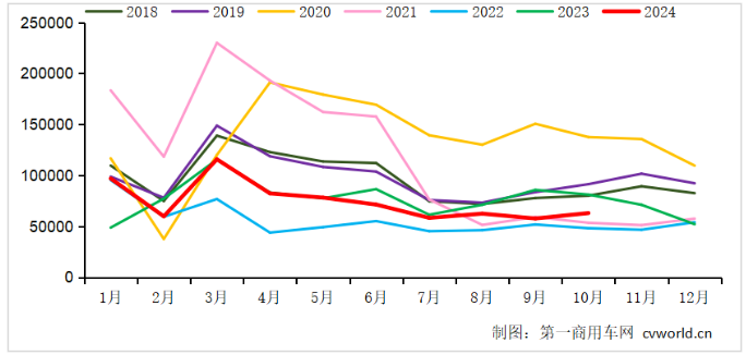 2024年10月份,我國(guó)重卡市場(chǎng)銷售約6.3萬輛(批發(fā)口徑,包含出口和新能源),環(huán)比上漲9%,但相比上年同期的8.11萬輛下滑22%,減少了約 1.8萬輛。6.3萬輛放在最近八年來看,高于2022年10月和2021年10月,低于其他年份的10月份銷量。累計(jì)來看,2024年1-10月,我國(guó)重卡市場(chǎng)銷售各類車型約74.6萬輛,累計(jì)降幅擴(kuò)大到5%。