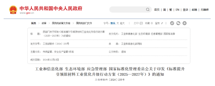 2024年12月13日,工業(yè)和信息化部、生態(tài)環(huán)境部、應(yīng)急管理部、國家標(biāo)準(zhǔn)化管理委員會(huì)聯(lián)合印發(fā)《標(biāo)準(zhǔn)提升引領(lǐng)原材料工業(yè)優(yōu)化升級(jí)行動(dòng)方案(2025—2027年)》。