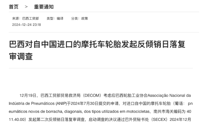 近日,巴西輪胎工業(yè)協(xié)會(ANIP)于2024年7月30日提出申請,要求對進口自中國的摩托車輪胎(南共市海關編碼4011.40.00)進行第二次反傾銷日落復審調(diào)查。隨后,商務部于2025年1月6日發(fā)布消息,巴西外貿(mào)秘書處已在去年12月19日的官方日報上發(fā)布了2024年第76號公告,正式宣布對來自中國、泰國、越南的摩托車輪胎啟動反傾銷日落復審調(diào)查。此次傾銷調(diào)查覆蓋了2023年4月至2024年3月的時間段,而損害分析期則追溯至2019年4月至2024年3月。