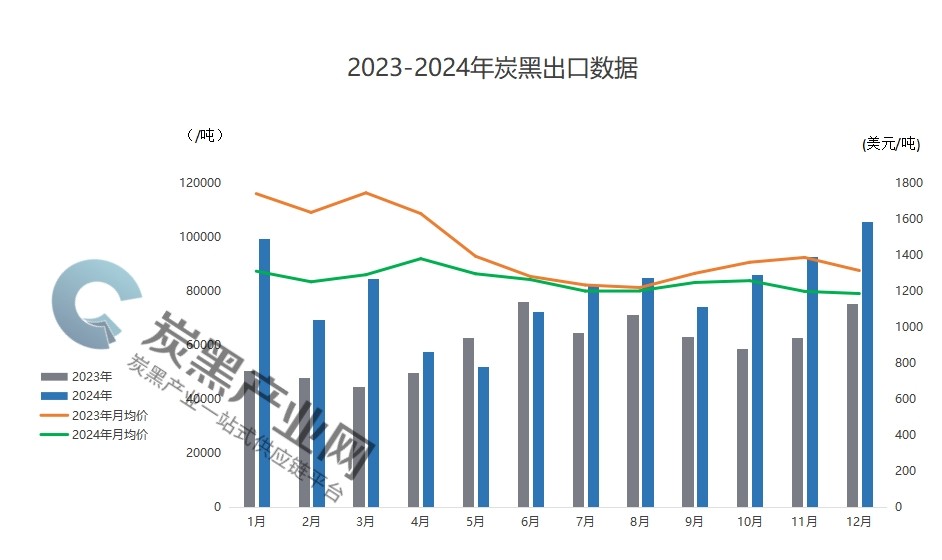 2024年炭黑出口總量為96.16萬(wàn)噸,同比增長(zhǎng)32.26%;出口均價(jià)為美元1250/噸,同比下降11.17%。