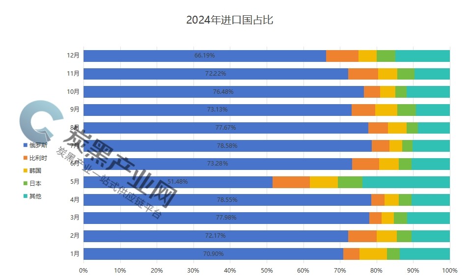 2024年炭黑進(jìn)口總量為30.08萬(wàn)噸,同比增長(zhǎng)9.7%;進(jìn)口均價(jià)為1920美元/噸,同比上漲3.01%。進(jìn)口依賴度達(dá)到5.11%,其中進(jìn)口俄羅斯的占比依舊處于高位,全年占比73.44%。