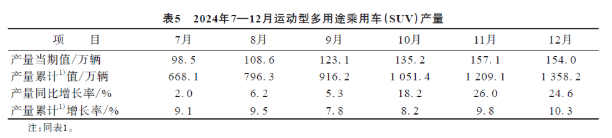 12月份,我國SUV產(chǎn)量為154.0萬輛,同比增長率為24.6%;1—12月累計產(chǎn)量為1358.2萬輛,累計增長率為10.3%。