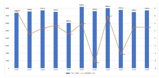 據(jù)國家統(tǒng)計局?jǐn)?shù)據(jù),2024年全國塑料制品行業(yè)匯總統(tǒng)計企業(yè)完成產(chǎn)量7707.6萬噸,同比增長2.9%。產(chǎn)量進(jìn)一步向疫情前水平邁進(jìn)。單就產(chǎn)量增長率而言,仍有較大上升潛力。2014-2024年我國塑料制品產(chǎn)量及增長率見圖1。