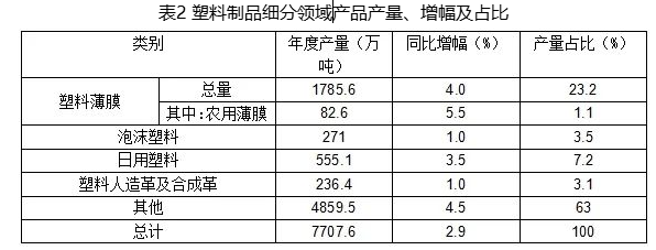 具體到塑料制品的各細(xì)分領(lǐng)域,包括塑料板管型材、塑料絲繩及編織品、塑料包裝箱及容器、塑料零件及其他塑料制品類別的產(chǎn)量為4859.5萬噸,占比高達(dá)63%。占比第二位是塑料薄膜,產(chǎn)量1785.6萬噸,占比23.2%;其中農(nóng)用薄膜產(chǎn)量為81.6萬噸,同比增長5.5%。此外,泡沫塑料產(chǎn)量同比增長1.0%,日用塑料產(chǎn)量同比增長3.5%,塑料人造革及合成革產(chǎn)量同比增長1.0%。詳見表2。