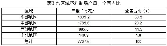 從區(qū)域情況來看,2024年,東部十省區(qū)(統(tǒng)計數(shù)據(jù)未含港澳臺地區(qū)產(chǎn)量)塑料制品產(chǎn)量4895.2萬噸,同比增長3.3%,全國占比63.5%,較2023年全國占比增長0.2個百分點(diǎn);中部六省塑料制品產(chǎn)量1785.8萬噸,同比增長19.9%,全國占比23.2%,全國占比較2023年增長3.3個百分點(diǎn);西部十二省區(qū)塑料制品產(chǎn)量885.6萬噸,同比下降20.2%,全國占比11.5%,較2023年全國占比下降3.2個百分點(diǎn);東北三省塑料制品產(chǎn)量140.9萬噸,同比下降7.3%,全國占比1.8%,較2023年全國占比下降0.2個百分點(diǎn)。詳見表3。