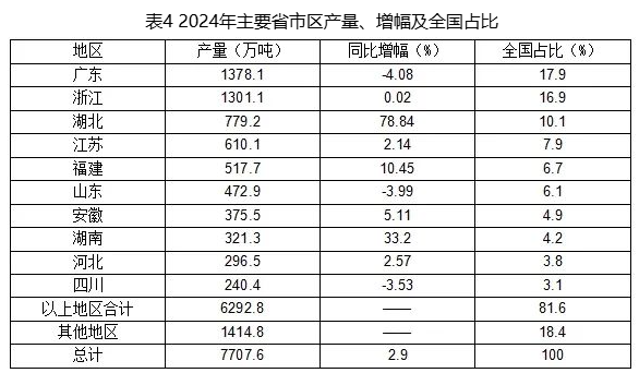 從省區(qū)情況來看,年度產(chǎn)量排名靠前的依然是廣東省、浙江省、湖北省、江蘇省、福建省、山東省等傳統(tǒng)大省,且優(yōu)勢穩(wěn)固。其中,湖北省憑借78.8%的同比增長率,比上年上升一位位居第三。2024年全國塑料制品產(chǎn)量前十的省區(qū)中,東部地區(qū)省份超過半數(shù),廣東省全年完成產(chǎn)量1378.1萬噸,同比雖下降4%,但依然位居第一,全國占比17.9%;浙江省全年完成產(chǎn)量1301.1萬噸,與上年基本保持同一水平,全國占比16.9%。2024年全國塑料制品產(chǎn)量前十的省區(qū),貢獻(xiàn)了占全國比例81.6%的產(chǎn)量,基本保持了同等水平,憑借深厚的輕工業(yè)底蘊(yùn)、多元的產(chǎn)業(yè)結(jié)構(gòu)及完善的產(chǎn)業(yè)配套與區(qū)位聚集優(yōu)勢,塑料制品傳統(tǒng)大省的優(yōu)勢持續(xù)穩(wěn)固。詳見表4。