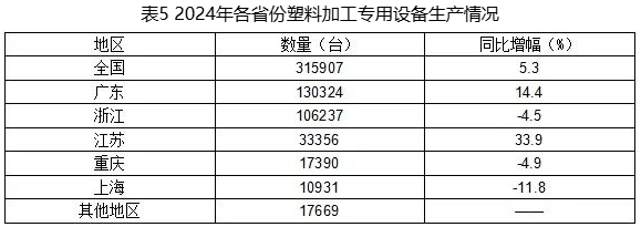 塑料薄膜全年產(chǎn)量最高的5個省份依次是:浙江省、廣東省、江蘇省、福建省、山東省;農(nóng)用薄膜產(chǎn)量最高的5個省份依次是:甘肅省、云南省、山東省、廣東省、河南省;作為農(nóng)用薄膜的主產(chǎn)省份,甘肅省在該細(xì)分品類的年度產(chǎn)量同比增長20.2%,由上年的第三位躍升至第一位。泡沫塑料產(chǎn)量最高的5個省份依次是:廣東省、浙江省、江蘇省、福建省、河南省。在日用塑料制品領(lǐng)域,廣東省與浙江省繼續(xù)高居產(chǎn)量前列,且優(yōu)勢十分顯著。在塑料人造革及合成革領(lǐng)域,浙江省在該細(xì)分品類的年度產(chǎn)量依然排名首位,福建省緊隨其后。6、塑料加工專用設(shè)備產(chǎn)量情況我國塑料加工專用設(shè)備產(chǎn)能主要集中在東部地區(qū),廣東與浙江兩省產(chǎn)量占據(jù)全國產(chǎn)量的七成以上。2024年,在大規(guī)模設(shè)備更新行動方案等政策以及出口增長影響下,全國塑料加工專用設(shè)備產(chǎn)量有所提升,同比增長5.3%。詳見表5。