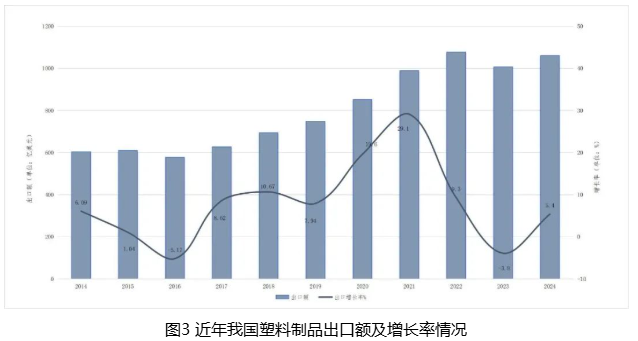 2024年,我國貨物貿(mào)易進(jìn)出口總值43.85萬億元,同比增長5%,外貿(mào)規(guī)模再創(chuàng)歷史新高。我國塑料制品行業(yè)與我國外貿(mào)大趨勢同步,持續(xù)釋放澎湃動能。據(jù)海關(guān)總署數(shù)據(jù),2024年塑料制品出口總額1060.9億美元,同比增長5.4%,貿(mào)易順差882.9億美元,占全國貨物貿(mào)易進(jìn)出口順差的8.9%。在近年外部環(huán)境動蕩不安、貿(mào)易保護(hù)主義蔓延等不利因素交織的背景下,我國塑料制品行業(yè)的外貿(mào)運(yùn)行展現(xiàn)出較強(qiáng)的韌性。2014-2024年我國塑料制品出口額及增長率情況見圖3。