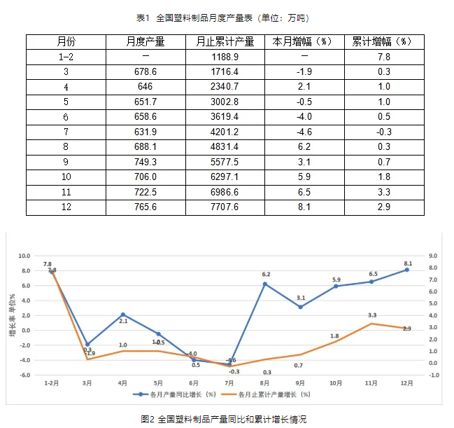 2024年1-12月,全國塑料制品行業(yè)產量7707.6萬噸,同比增長2.9%。
