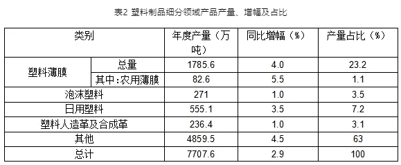 具體到塑料制品的各細分領域,包括塑料板管型材、塑料絲繩及編織品、塑料包裝箱及容器、塑料零件及其他塑料制品類別的產量為4859.5萬噸,占比高達63%。占比第二位是塑料薄膜,產量1785.6萬噸,占比23.2%;其中農用薄膜產量為81.6萬噸,同比增長5.5%。此外,泡沫塑料產量同比增長1.0%,日用塑料產量同比增長3.5%,塑料人造革及合成革產量同比增長1.0%。