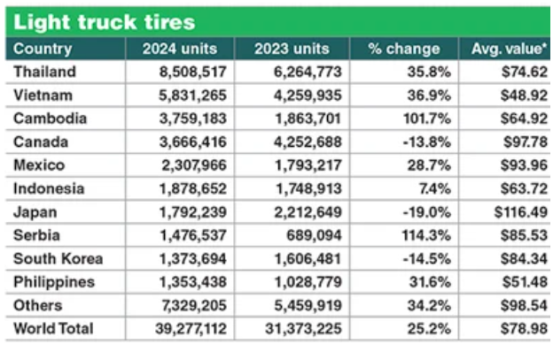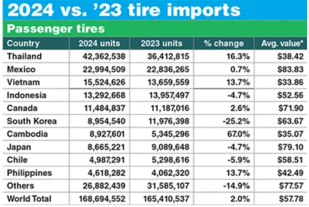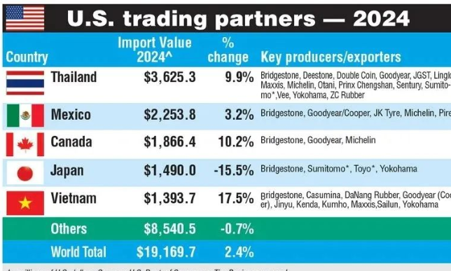 泰國(guó)仍然是美國(guó)最大的輪胎供應(yīng)國(guó),2024年進(jìn)口額為36億美元。與2023年相比增長(zhǎng)了9.9%,與過(guò)去兩年相比增長(zhǎng)了13.6%。
