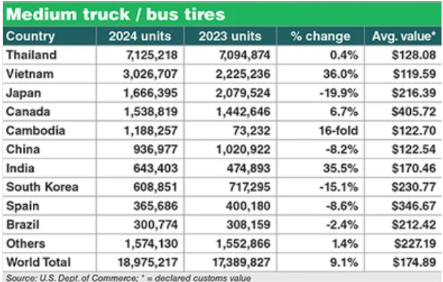 越南在2024年以13.9億美元的進(jìn)口額躋身美國(guó)前五大輪胎來(lái)源國(guó)之列,比2023年增長(zhǎng)17.5%。該國(guó)是乘用車(chē)輪胎的第三大供應(yīng)商,2024年的銷(xiāo)量增長(zhǎng)了13.7%。在輕型和中型卡車(chē)胎領(lǐng)域,越南是第二大供應(yīng)商,與2023年相比分別增長(zhǎng)了36.9%和36%。