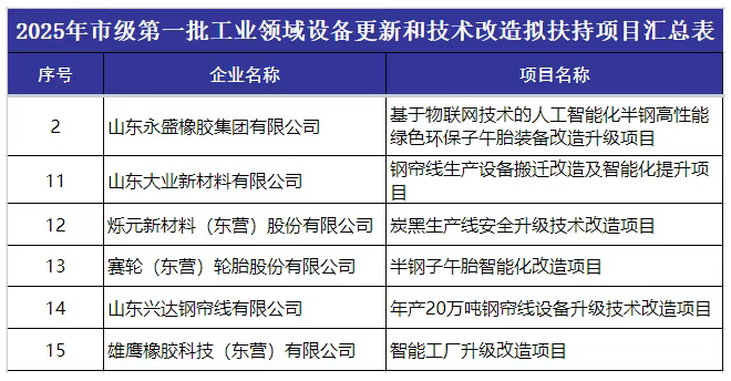 在公布的扶持項(xiàng)目中,輪胎行業(yè)表現(xiàn)尤為搶眼。永盛橡膠集團(tuán)、山東大業(yè)新材料、爍元新材料、賽輪東營(yíng)、興達(dá)鋼簾線以及雄鷹橡膠等多家輪胎企業(yè)的技術(shù)改造項(xiàng)目均榜上有名。這些項(xiàng)目的實(shí)施,不僅有助于提升輪胎企業(yè)的生產(chǎn)效率和產(chǎn)品質(zhì)量,還將進(jìn)一步推動(dòng)?xùn)|營(yíng)市輪胎產(chǎn)業(yè)的轉(zhuǎn)型升級(jí)。