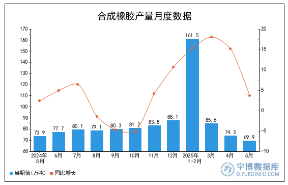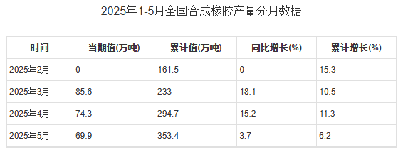 2025年5月全國合成橡膠產(chǎn)量69.9萬噸,同比增長3.7%,2025年1-5月全國合成橡膠產(chǎn)量為353.4萬噸,累計(jì)增長6.2%。