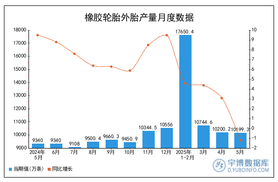 2025年5月全國橡膠輪胎外胎產(chǎn)量10199.3萬條,同比下降1.2%,2025年1-5月全國橡膠輪胎外胎產(chǎn)量為48896.2萬條,累計(jì)增長2.8%。