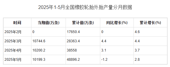 2025年5月全國橡膠輪胎外胎產(chǎn)量為10199.3萬條,累計(jì)值為48896.2萬條,同比下降1.2%,累計(jì)增長2.8%。