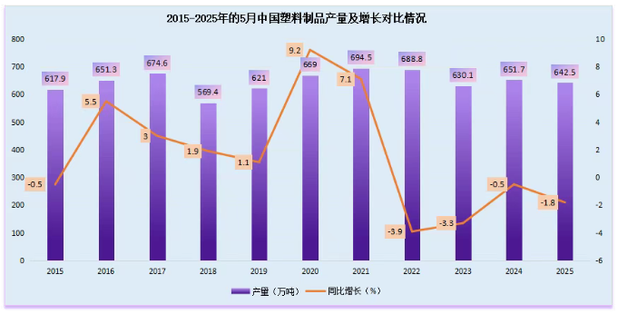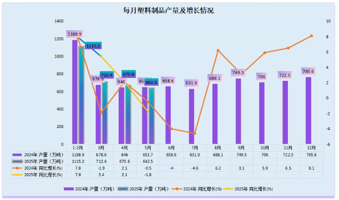 2025年5月塑料制品產(chǎn)量642.5萬噸,同比下降1.8%