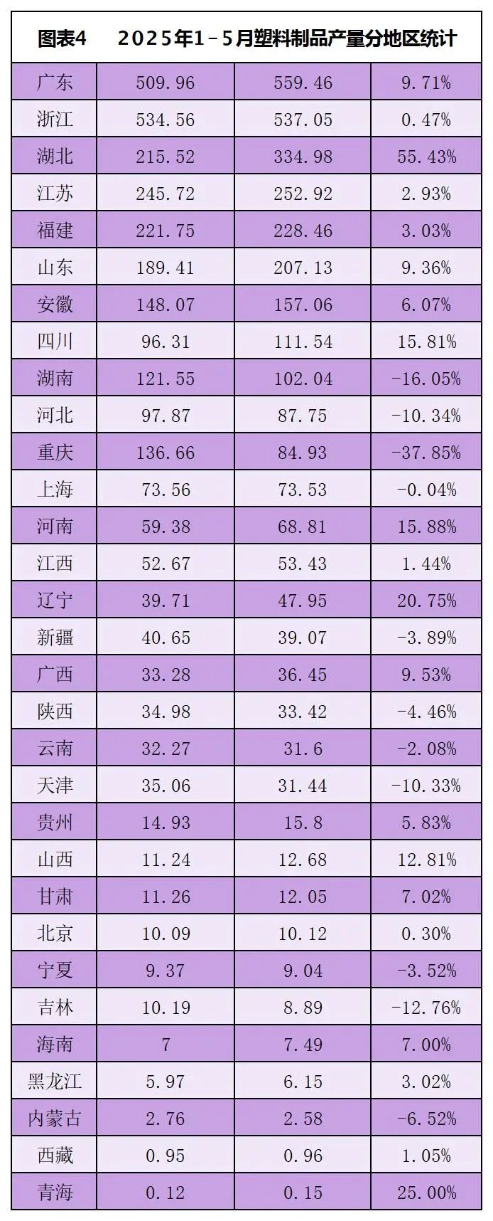2025年5月,在統(tǒng)計(jì)的31個(gè)省市中,有13個(gè)省市塑料制品產(chǎn)量同比增長,湖北和遼寧增長超過20%。排名前十的省份分別是浙江、廣東、湖北、江蘇、福建、山東、安徽、四川、湖南、河北,總產(chǎn)量524.85萬噸,占全國的81.69%。浙江產(chǎn)量排名第一,產(chǎn)量112.37萬噸,同比下降2.57%。
