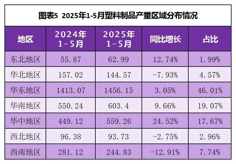 1-5月,華東地區(qū)以1456.15萬噸的產(chǎn)量位居榜首,占總產(chǎn)量的46.01%,顯示出其在塑料制品生產(chǎn)方面的絕對優(yōu)勢。東北地區(qū)產(chǎn)量為62.99萬噸,占總產(chǎn)量的1.99%,是產(chǎn)量最低的區(qū)域。華東、華南和華中地區(qū)合計(jì)占總產(chǎn)量的82.75%,是塑料制品生產(chǎn)的主要集中地。