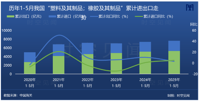 根據(jù)海關(guān)數(shù)據(jù),2025年1至5月,我國“橡膠及其制品”累計(jì)進(jìn)出口金額為1709.44億元,其中,累計(jì)出口金額1084.63億元,同比增長8.5%,累計(jì)進(jìn)口金額624.82億元,同比增長35.7%,進(jìn)出口金額前五位分別是:泰國、越南、俄羅斯、美國、馬來西亞。