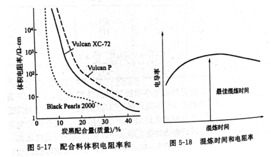 附聚體大小對(duì)電阻率的影響,可以從混煉時(shí)間對(duì)電阻率的影響間接的觀察到,因?yàn)榛鞜挄r(shí)間越長(zhǎng),附聚體的數(shù)量將增多,而大小將減少。導(dǎo)電炭黑添加量在不同載體中比例不同