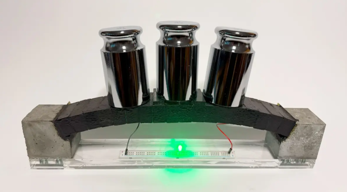 為直觀展示 EC3 的實用潛力,科研團隊特別建造了一個小型 EC3 拱門結構。測試結果顯示,這個拱門不僅能正常承受重量、發(fā)揮建筑結構功能,還能為 LED 燈供電;更值得關注的是,當拱門結構受到壓力時,LED 燈會出現(xiàn)閃爍現(xiàn)象,研究人員認為這一特性未來或可用于建筑健康狀況的實時監(jiān)測,進一步拓展材料的應用邊界。