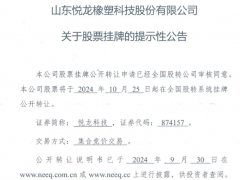 【炭黑產(chǎn)業(yè)網(wǎng)】10月28日消息,山東悅龍橡塑科技股份有限公司(簡(jiǎn)稱“悅龍科技”)于10月25日正式在新三板基礎(chǔ)層掛牌,證券代碼為874157,由中泰證券擔(dān)任主辦券商。此次掛牌過程中,北京海潤(rùn)天睿律師事務(wù)所和上會(huì)會(huì)計(jì)師事務(wù)所作為主要中介機(jī)構(gòu)發(fā)揮了重要作用。悅龍科技坐落