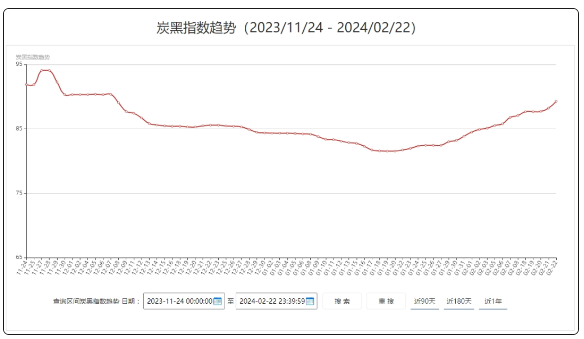炭黑產(chǎn)業(yè)網(wǎng)根據(jù)市場(chǎng)N330/N220/N550三個(gè)牌號(hào)最新市場(chǎng)成交價(jià)格,并分別按一、二、三線品牌權(quán)重分配計(jì)算后得出今日最新炭黑指數(shù)為89.28,從走勢(shì)曲線來看,近期炭黑表現(xiàn)持續(xù)上漲。