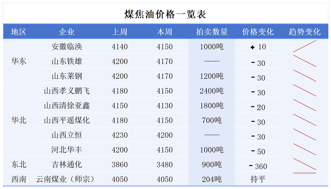 本周,國內(nèi)高溫煤焦油呈現(xiàn)盤整態(tài)勢,新單拍賣價格以小幅下調(diào)為主,部分地區(qū)小幅上漲。