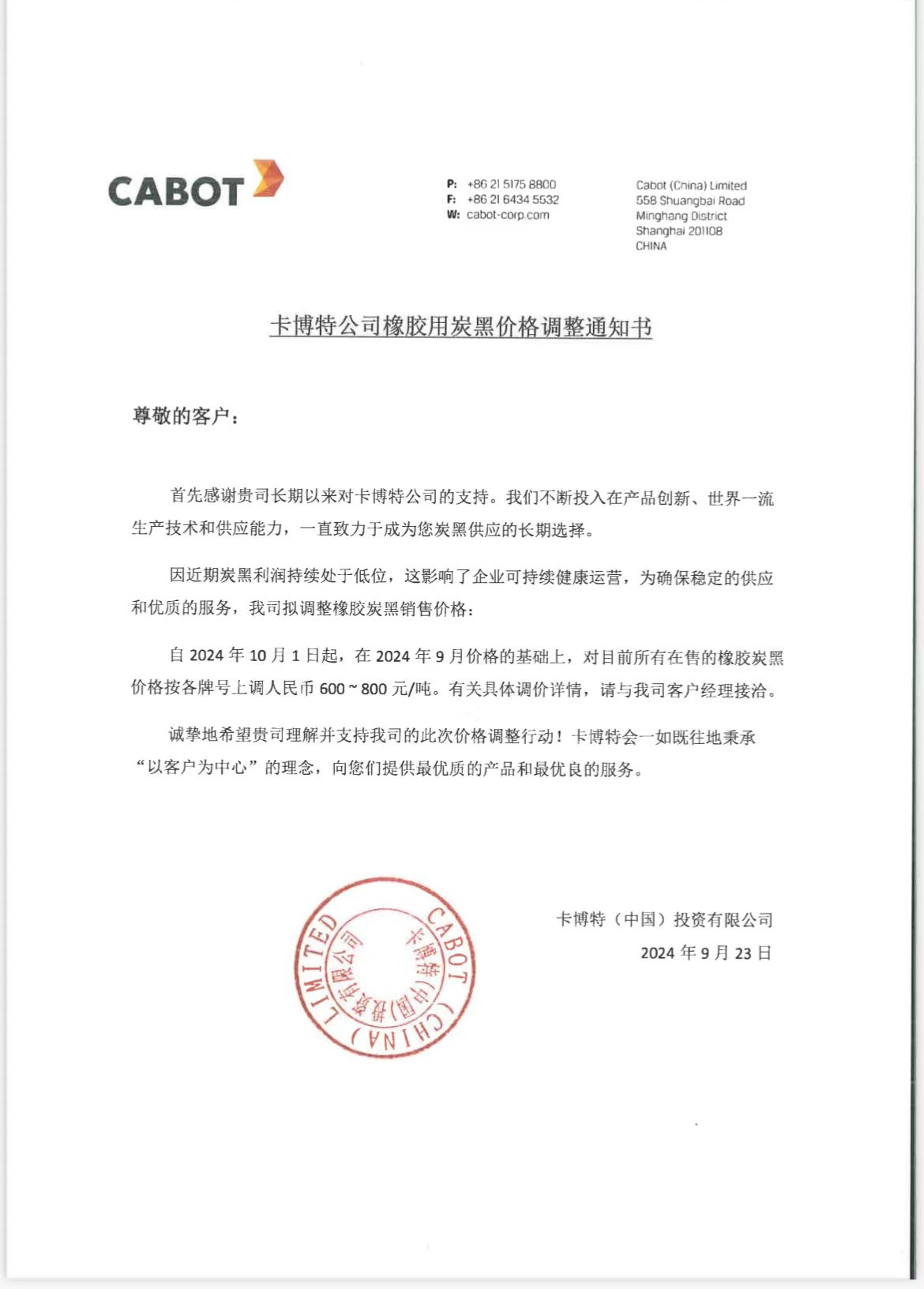 昨日,炭黑巨頭卡博特宣布自2024年10月1日起,在2024年9月價格的基礎(chǔ)上,對目前所有在售的橡膠炭黑價格按各牌號上調(diào)人民幣600~800元/噸。