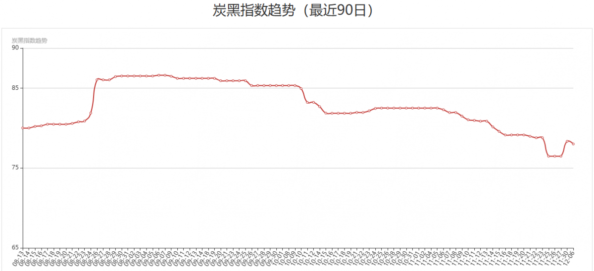 炭黑產(chǎn)業(yè)網(wǎng)根據(jù)市場N330/N220/N550三個牌號最新市場成交價格,并分別按一、二、三線品牌權(quán)重分配計(jì)算后得出今日最新炭黑指數(shù)為78.01,與之前相比炭黑指數(shù)依然維持在低谷區(qū)間。