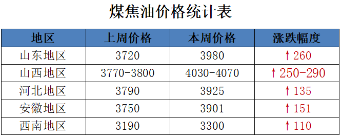 本周,國內(nèi)高溫煤焦油市場表現(xiàn)強(qiáng)勁,主流價(jià)格普遍上調(diào)了135-260元/噸,山西地區(qū)煤焦油價(jià)格已突破4000元/噸大關(guān)。在焦企開工負(fù)荷偏弱,市場煤焦油供應(yīng)相對緊張的情況下,焦化廠推漲情緒強(qiáng)烈。同時(shí),下游深加工企業(yè)暫時(shí)保持一定盈利狀態(tài),接貨積極性明顯提升,深加工主產(chǎn)品煤瀝青、蒽油、工業(yè)萘等產(chǎn)品推漲運(yùn)行,業(yè)者普遍對下周煤焦油持樂觀態(tài)度。