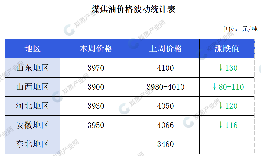 今日主流市場(chǎng)煤焦油新單拍賣(mài)較多,受深加工產(chǎn)品表現(xiàn)弱勢(shì),炭黑行情走低影響,主產(chǎn)區(qū)煤焦油新單成交仍以下行為主。