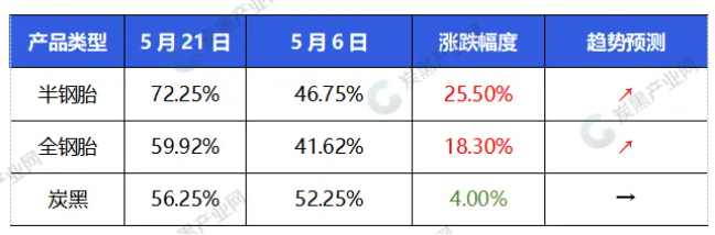 五一假期之后,輪胎廠開(kāi)工逐漸恢復(fù)提升,從開(kāi)工數(shù)據(jù)來(lái)看,較五一假期半鋼胎開(kāi)工率增長(zhǎng)25.5%,全鋼胎開(kāi)工率增長(zhǎng)18.3%,下游開(kāi)工不斷回升帶動(dòng)原料消耗量增加。且炭黑價(jià)格已處于近兩年來(lái)價(jià)格歷史低位,輪胎企業(yè)抄底采買(mǎi)下單,主力下游的集中采購(gòu)下單,直接使得炭黑廠完成去庫(kù)存,市場(chǎng)庫(kù)存降到合理位置。外加政策面消息下,對(duì)整個(gè)產(chǎn)業(yè)鏈來(lái)說(shuō),最先受到利好的就是輪胎行業(yè),需求端對(duì)未來(lái)市場(chǎng)信心的轉(zhuǎn)好,也帶動(dòng)了入市詢(xún)盤(pán)采買(mǎi)。