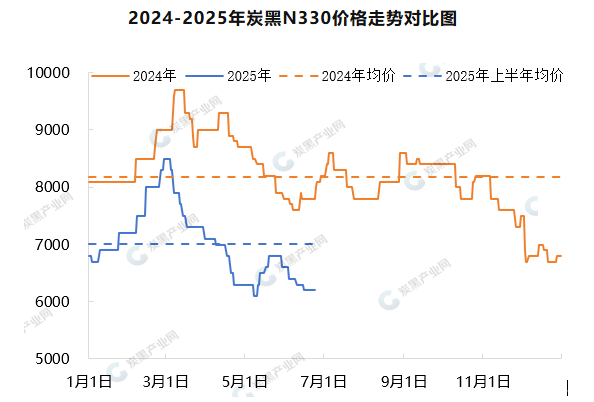 從歷史數(shù)據(jù)窺探行業(yè)發(fā)展邏輯,受行業(yè)基本運行邏輯和需求市場淡旺季影響,炭黑價格波動變化趨勢和時間節(jié)點與往年價格走勢相似,但是2025年價格重心遠低于去年同期,價格高低價差較去年收窄,上半年均價在7006.86元/噸,同比跌幅在17.68%。價格重心下行,一是由于隨著2025年新增產(chǎn)能投產(chǎn)落地,但需求增量不及供應擴增,市場供大于求矛盾加劇,影響市場價格進入低位、盈虧線徘徊期;二是原料高溫煤焦油價格走低影響,炭黑與煤焦油走勢高度掛鉤,高溫煤焦油價格公開透明,對于市場上下游從業(yè)者評判分析影響較大。