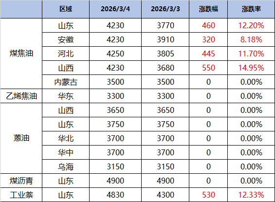本周煤焦油價格寬幅上行,主流區(qū)域漲破4200元,漲幅在320-460元/噸,遠超出市場預(yù)期。