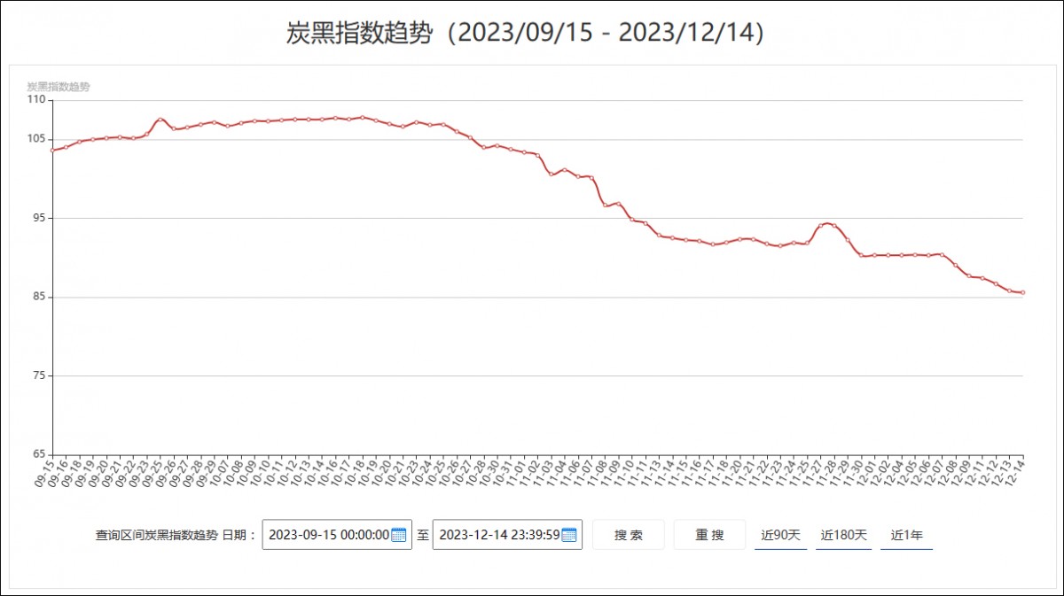 炭黑產業(yè)網根據市場N330/N220/N550三個牌號最新市場成交價格,并分別按一、二、三線品牌權重分配計算后得出今日最新炭黑指數為85.61,與上周情況相比跌4.76,可以看出近期市場炭黑實際成交價格明顯走弱。